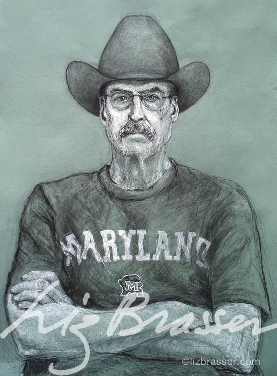 Raymond In His StetsonIn 1980 I gave Raymond this hat as a wedding gift, and took a photo of him wearing it. Here he is in the same pose and the same hat in 2018. Charcoal on archival paper. Unframed size: 25 x 19 inches (635 x 482.6 cm) |